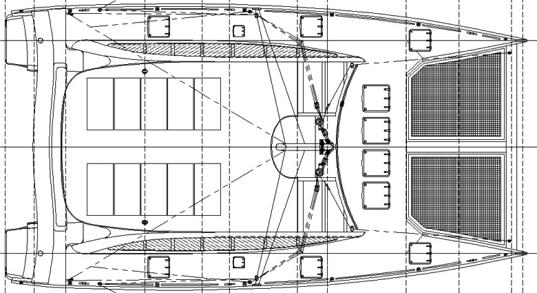 La giunzione tra gli scafi e il ponte cabinato è composta da una estesa triangolazione strutturale che assicura robustezza e rigidità. Tutti i locali della barca sono facilmente accessibili, così come i boccaporti, i portelli i gavoni.