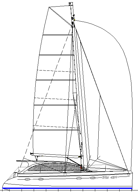 Il piano velico è composto da un albero poggiato in coperta supportato da sartie alte e basse, e volanti. Randa full-batten con fiocco olimpico e spi asimmetrico. Tutte le manovre sono rinviate al pozzetto di prua interno, dove trovano posto anche i winches. E' possibile installare due motori da 30hp con sail-drive ed elica piegevole. I servatoi sono distribuiti sui due scafi, con capacità di 575lt. ciascuno.