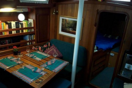 A dritta della discesa troviamo il cuccettone di quarto e, subito dopo, un grande tavolo da carteggio. Sull'altro lato troviamo l'ampio locale toilette e