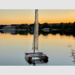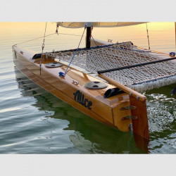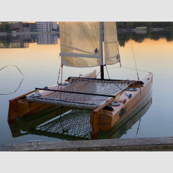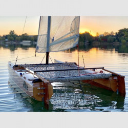 Il suo aspetto è assolutamente moderno, in linea con tutti i recenti cat da regata: le chiglie, modellate e integrate nei due scafi, offrono grandi capacità di manovra sopravvento e in virata senza la necessità delle derive. Il ridotto pescaggio (200mm) consente di navigare anche in acque poco profonde e di spiaggiare con estrema facilità. I timoni sono fissi per semplicità e non superano il pescaggio degli scafi.