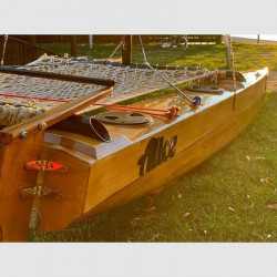Il progetto era nato per la costruzione in vetroresina su commissione di un piccolo cantiere che ora ha cessato l’attività. Dopo innumerevoli richieste per una versione in legno, è ora disponibile per l’autocostruzione. Le paratie, quasi tutte permanenti, sono in compensato marino; gli scafi sono realizzati in parte in strip planking con strisce di cedro rosso o abete, e in parte in compensato marino. Una leggera laminazione di tessuto e-glass completa la costruzione.