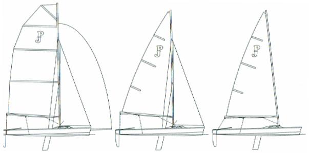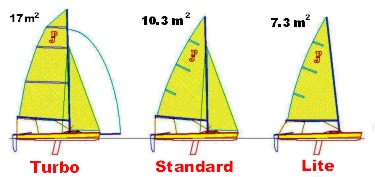 Turbo: doppio ad alte prestazioni, con randa e fiocco maggiorati, bompresso e jennaker, trapezio.