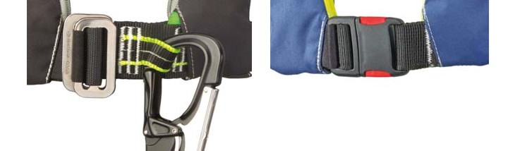 A sinistra: giubbotto con passante in tessuto per imbragatura, cucito orizzontalmente per maggiore ergonomia; in fibra hi-tech resistente con inserto catarifrangente, leggera ma abbastanza rigida per agganciare facilmente il cavo (moschettone, non incluso); fibbia a incastro in acciaio inox. A destra: fibbia per giubbotti senza attacco per imbragatura con doppio pulsante di sicurezza, più facile e rapido da aprire e chiudere.