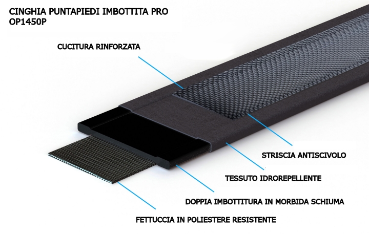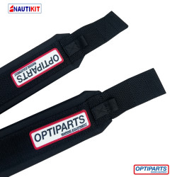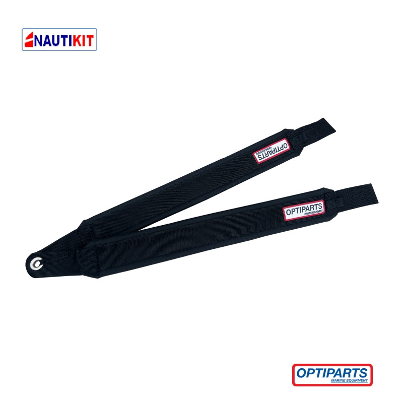 Cinghie imbottite Optimist larghe 7 cm, realizzate in robusta fettuccia di poliestere e rivestite in tessuto antiusura e perfettamente resistente ai raggi UV. Sono imbottite con una piastra in schiuma extra rigida, che non assorbe acqua. Robusta struttura con cuciture passanti e logo in gomma. L'estremità posteriore presenta un anello pressato e una cucitura piatta per evitare torsioni.