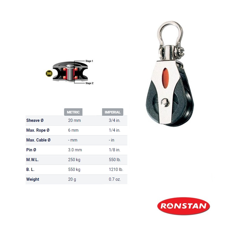Puleggia Ø20 in acetato resistente ai raggi UV su cuscinetti a sfera inox. Guance in nylon UV rinforzato con struttura in accaio inox 316