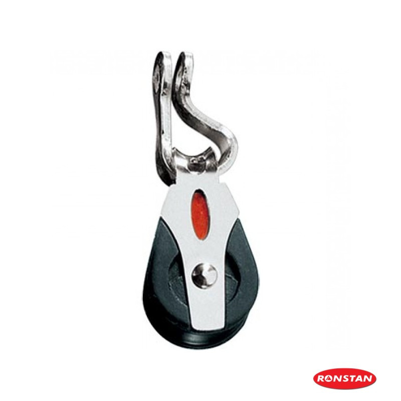 Bozzello singolo girevole 20mm con grillo Puleggia Ø20 in acetato resistente ai raggi UV su cuscinetti a sfera inox. Guance in nylon UV rinforzato con struttura in accaio inox 316 per cime di controllo, cunningham, vang su derive e catamarani